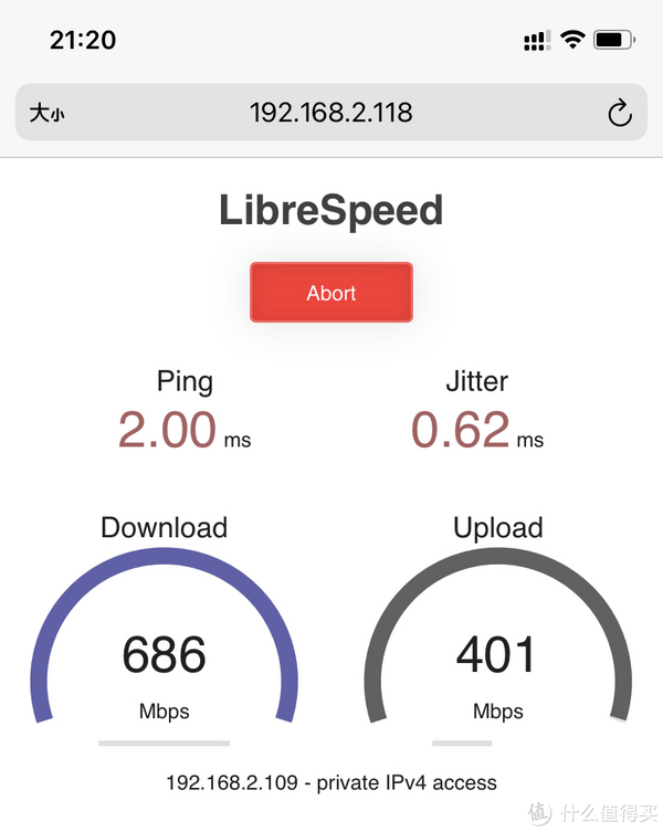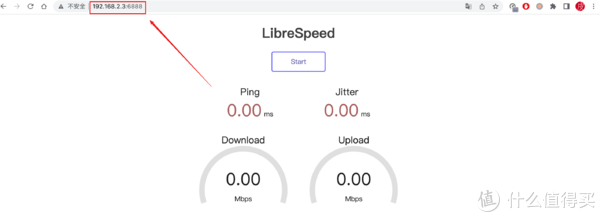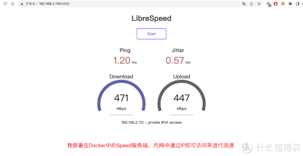 使用很简单,如右图,内部网NAS中搭建LibreSpeed慢速伺服器端后,通过内部网IP加端口即可出访,点击Start即可开始慢速。