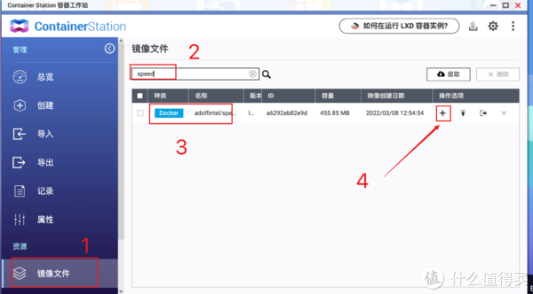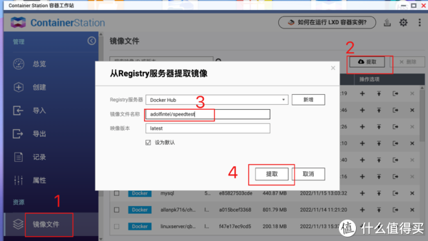 进入威联通后台,加装Containter Station即Docker后,镜像文件-提取,输入adolfintel/speedtest,提取即可,右上角会有进度条显示拉取与否完成。