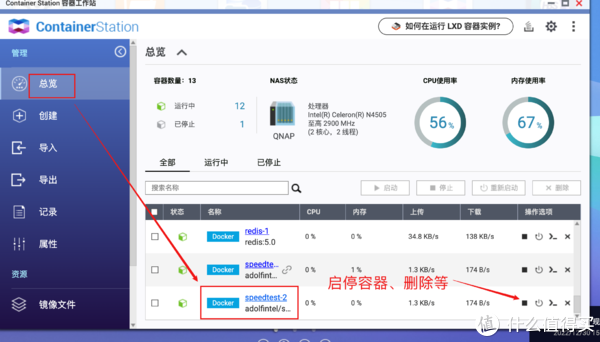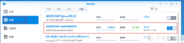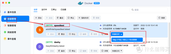 在总览处,即可看见创建成功的speedtest容器,后面按钮可进行停止、启动、删除等操作方式。