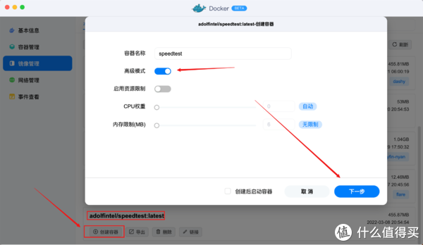 找到拉取回来的adolfintel/speedtest,点击创建容器,关上高级模式,下一步。