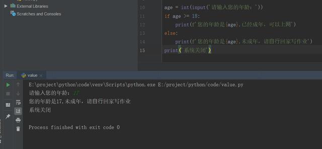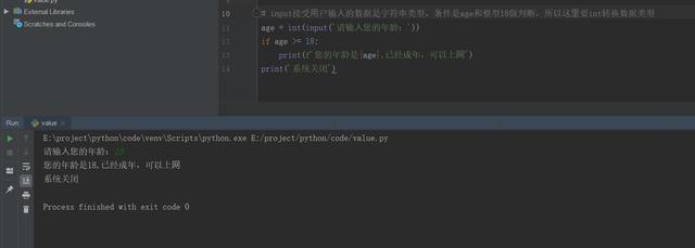 # input接受⽤户输⼊的数据是字符串类型,前提是age和整型18做推论,因此这⾥要int转换数据类型 age = int(input(请输⼊您的年纪:)) if age >= 18: print(f您的年纪是{age},早已初生,能上⽹) print(系统关闭)
