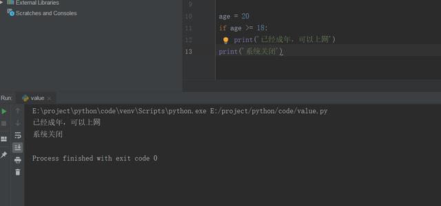 age = 20 if age >= 18: print(早已初生,能上⽹) print(系统关闭)