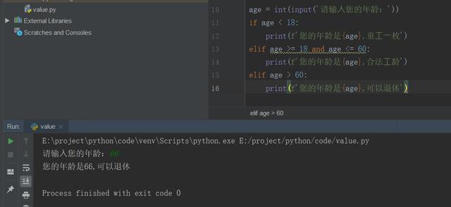 age = int(input(请输⼊您的年纪:)) if age < 18: print(f您的年纪是{age},童⼯⼀枚) elif age >= 18 and age <= 60: print(f您的年纪是{age},合法⼯龄) elif age > 60: print(f您的年纪是{age},能退休)
