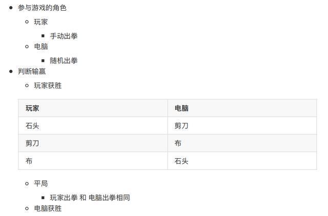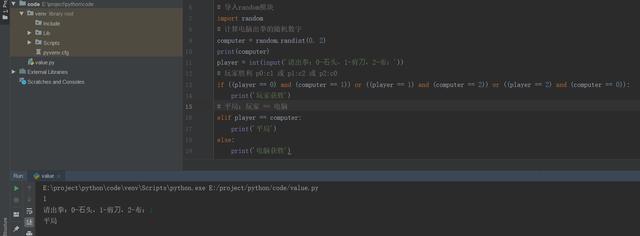 random.randint(开始,结束) “”” 提示:0-⽯头,1-剪⼑,2-布 1. 出拳玩家输⼊出拳电脑随机出拳 2. 推论输赢玩家获胜平局电脑获胜 “”” # 导⼊random模块 import random # 计算电脑出拳的随机数字 computer = random.randint(0, 2) print(computer) player = int(input(请出拳:0-⽯头,1-剪⼑,2-布:)) # 玩家胜利 p0:c1 或 p1:c2 或 p2:c0 if ((player == 0) and (computer == 1) or ((player == 1) and (computer == 2) or ((player == 2) and (computer == 0)): print(玩家获胜) # 平局:玩家 == 电脑 elif player == computer: print(平局) else: print(电脑获胜)