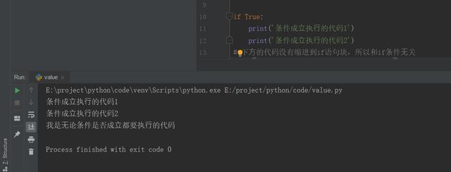 if True: print(前提成⽴执⾏的标识符1) print(前提成⽴执⾏的标识符2) # 下⽅的标识符没对齐到if句子块,因此和if前提⽆关 print(我是⽆论前提与否成⽴都要执⾏的标识符)