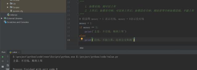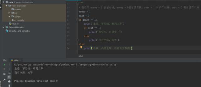 表示有空座,seat = 0 表示没空座 money = 1 seat = 0 if money == 1: print(⼟豪,不差钱,顺利上⻋) if seat == 1: print(有空座,能坐下) else: print(没空座,站等) else: print(没钱,不能上⻋,追着公交⻋跑)