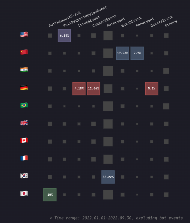 开发人员行为的地理分布透过查询 2022 年 1 月 1 日至 9 月 30 日期间,全球开发人员在 GitHub 上产出的各种该事件的数量,OSS Insight 统计出了 10 个热门国家/地区开发人员的具体文本行为。该图表按国家或地区显示每种该事件类型的比例。