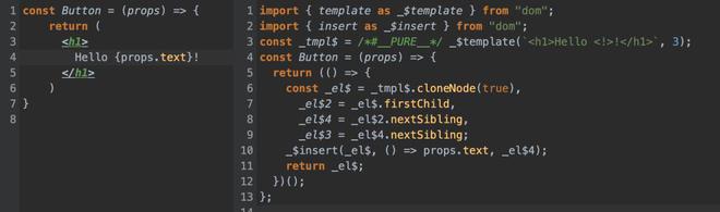 {{ msg }} 会被编译成如下标识符:function renderMainFragment(root, component, target) { var a = document . createElement(a); var text = document . createTextNode(root . msg); a . appendChild(text); target . appendChild(a) return { update: function (changed, root) { text . data = root . msg; }, teardown: function (detach) { if (detach) a . parentNode . removeChild(a); } }; } 能看到,跟如前所述 Virtual DOM 的架构相比,这样的输出不须要 Virtual DOM 的 diff/patch 操作方式,自然能省去大量标识符,同时,操控性上也和 vanilla JS 相差无几(仅就这个简单示例而言),内存占用更是极佳。这个思路其实并不是它首创,之前有两个操控性爆表的模板引擎 Monkberry.js 也是这样实现的,ng2 的模板编译其实也跟这个很类似于(但是中间加了一层渲染抽象层)。 如何看待 svelte 这个后端架构?- 尤雨溪的回答 – 知乎 https://www.zhihu.com/question/53150351/answer/133912199SolidJS 也是 Precompile,和 Svelte2 相比有少量的运行时,目前 Svelte 也改为有少量运行时的计划来减少标识符表面积,所以支持 Tree Shaking。
