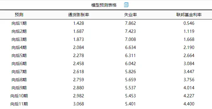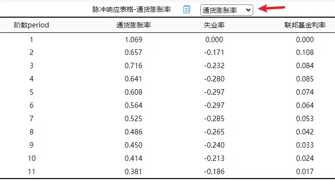 除此之外,关于就业率对于3个科学研究表达式的冲激响应预测表单或图,也或者联邦政府基金基准利率对于3个科学研究 表达式的冲激响应预测表单或图。可通过下拉选择展开切换展示预测。
