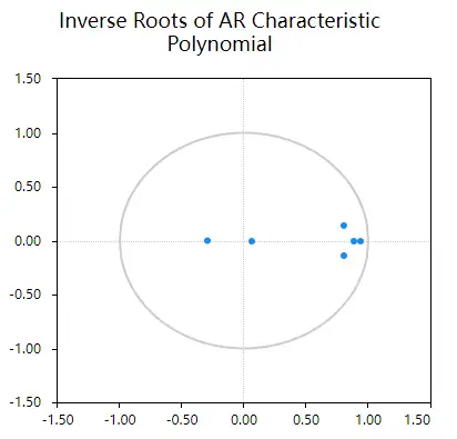 VAR数学模型构筑后,可以通过AR根图推论VAR数学模型的稳定性;假如所有特征值均在基层单位圆内,即所有点均在圆内,这时表明数学模型具有稳定性;假如出现特征根在基层单位圆之外,意味着数学模型可能不具有长期持续稳定性。