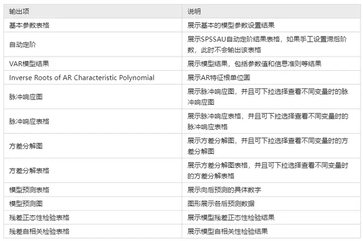 涉及以下两个关键点,分别如下表右图:VAR数学模型前一般来说还需要展开ii检测(或者查阅时序图)、协整检测,并且在数学模型后一般来说还须要查阅希克斯因果检测,该4项可通过SPSSAU的其它单独预测按钮展开预测采用。假如VAR数学模型前科学研究表达式有ii,并且不满足用户同阶单整,通常不建议采用VAR数学模型;假如科学研究表达式无ii(或者时序图展示基本平稳),也或者有ii但是满足用户同阶单整,那么这时可直接采用VAR数学模型。VAR数学模型有著较多的先决条件,并且数学模型预测之后还有较多检测(比如说正行决定,假如须要对比数学模型优劣,一般来说可采用数学模型输出的信息准则指标展开综合对比选择方可。7疑难解惑