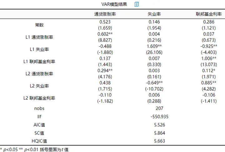 上表单展示VAR数学模型参数结果值;一般来说情况下上表单中值的意味相对较小,假如须要预测,首先查阅是否显著,假如呈现出显著性后再预测影响亲密关系情况,一般来说情况下并不须要预测,本次也并不对上述参数进行预测,其仅作展示采用。另外,上表单中还提供llf似然值,以及AIC、SC和HQIC这3个信息准则值。