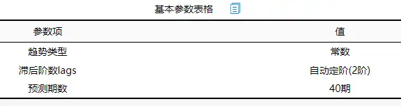 上表单展示VAR数学模型参数设置情况,包括趋势类型、发展缓慢特征值情况和预期期数;其仅为数学模型设置的参数展示,并不特别预测意义。本次数学模型时自动定阶为2阶,即构筑VAR(2)数学模型。