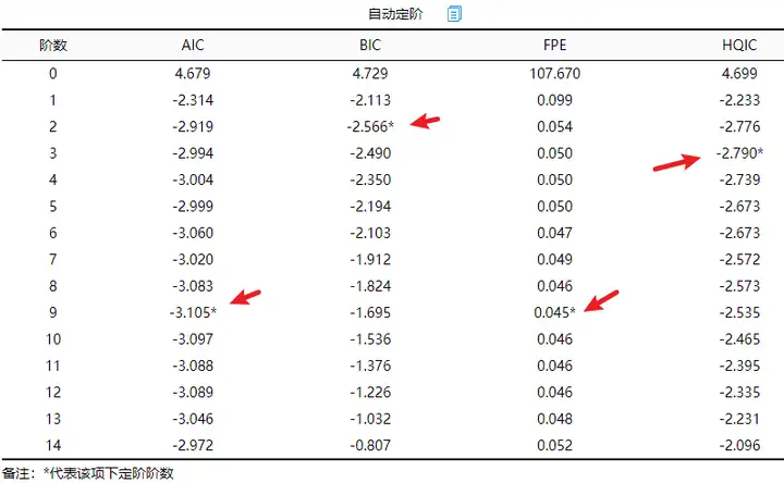 上表单展示自动定阶的过程值,SPSSAU自动定阶的原则为信息准则值越小越优,共有提供4个指标值,分别是AIC、BIC、FPE和HQIC,假如按照AIC准则时应该以9阶为准, BIC准则时应该以2阶为准, FPE时应该以9阶为准, HQIC准则时应该以3阶为准。4个指标值中最小值为2阶,因此SPSSAU最终以2阶为准构筑VAR数学模型。