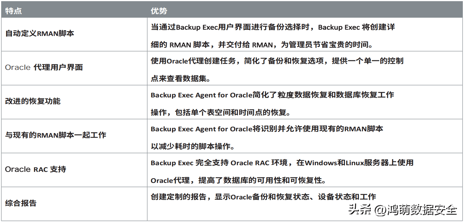 Backup Exec 利用 Oracle 的能力和技术,为 Oracle 资料库组件提供更多完整的为保护,主要包括: