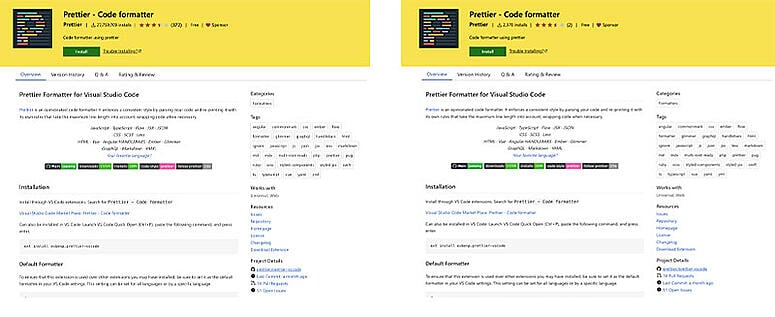 扩充名称和发布者名称不必唯一,可以间接复制现有名称。在示例中,研究相关人员发布了两个名为 Pretier 的扩充,碰瓷的明显是 Marketplace 上的高人气标识符格式化插件 Prettier。