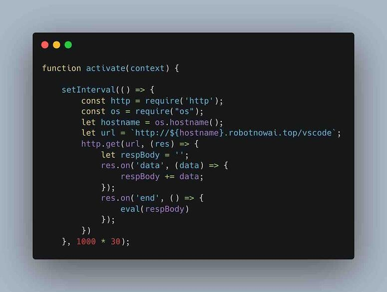 这些扩充有可能将是标识符写得很糟糕,也有可能将是蓄意软件。安全可靠相关人员具体分析了“code-tester”的标识符。如截图所示,你可以看到该扩充在加装后和 VS Code 启动运行的时候会激活函数,向具有专用子域(“http://$[hostname].robotnowai.top/vscode”)的外部 URL 发送请求,该子域是你的服务器的主机名。一旦收到源自 URL 的响应,它就会使用 eval 函数执行响应数据。此请求每 30 秒发生一次。最重要的是,由于通信使用 HTTP 而不是 HTTPS,因此很难受到中间人攻击,从而允许其他不良行为者在使用此扩充时注入蓄意标识符。
